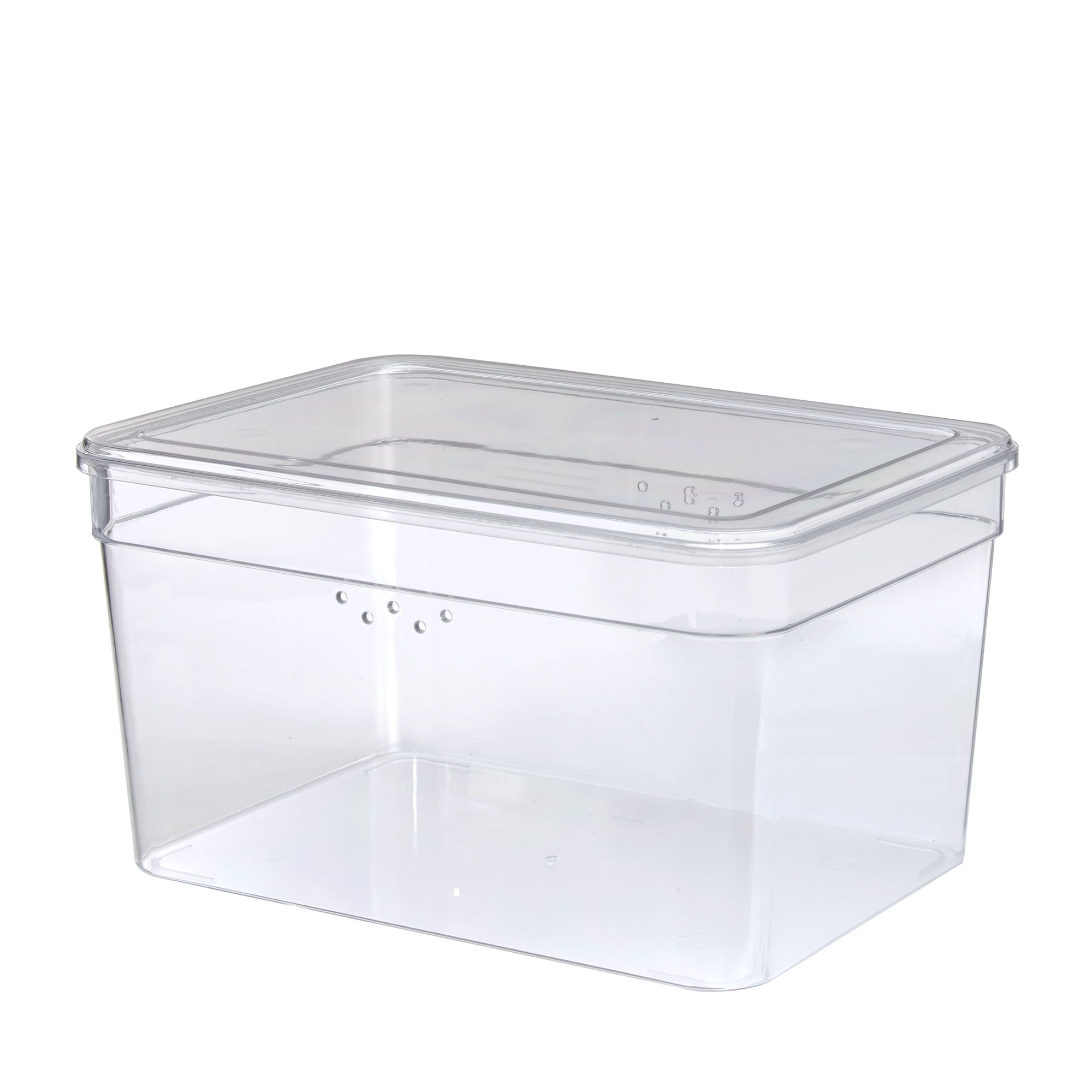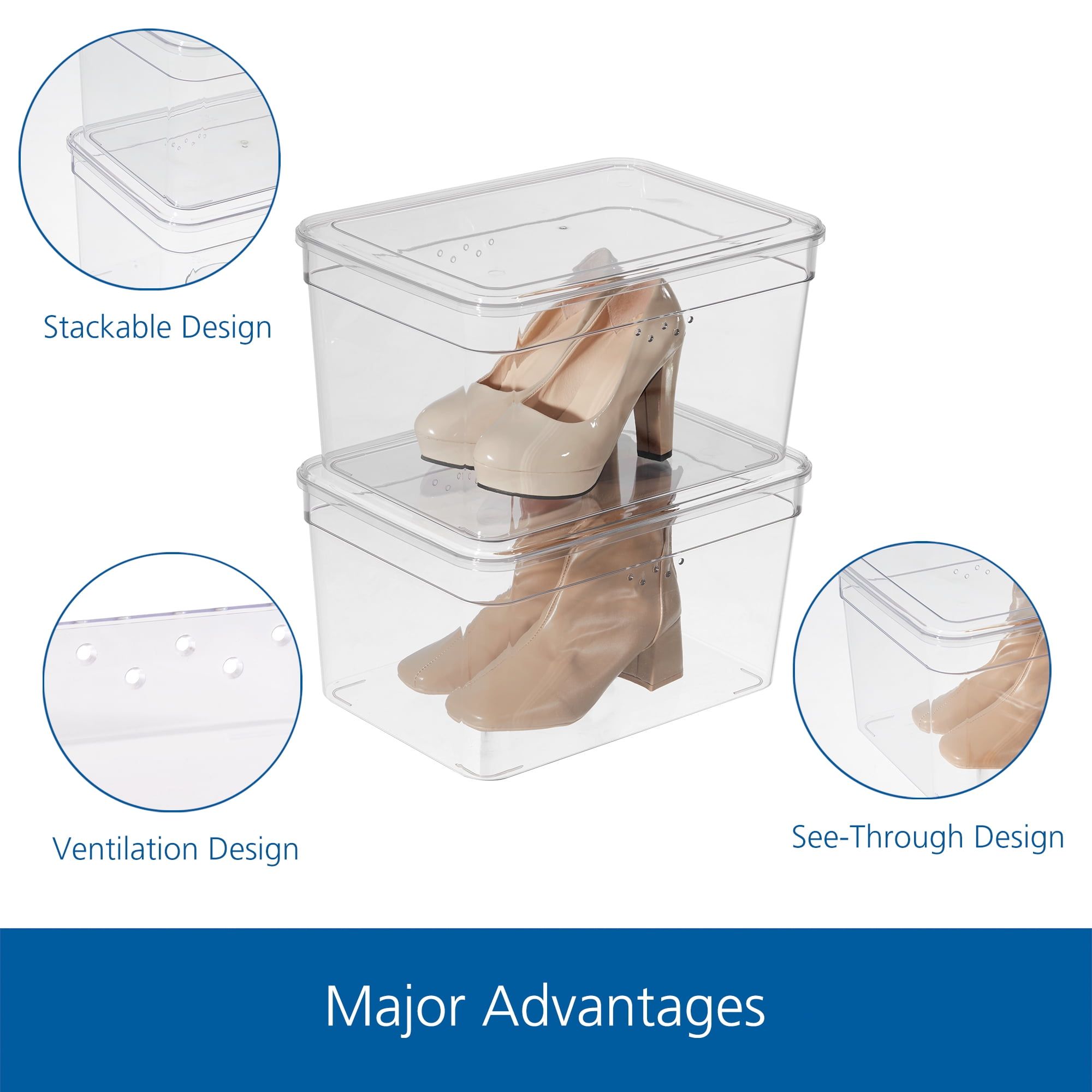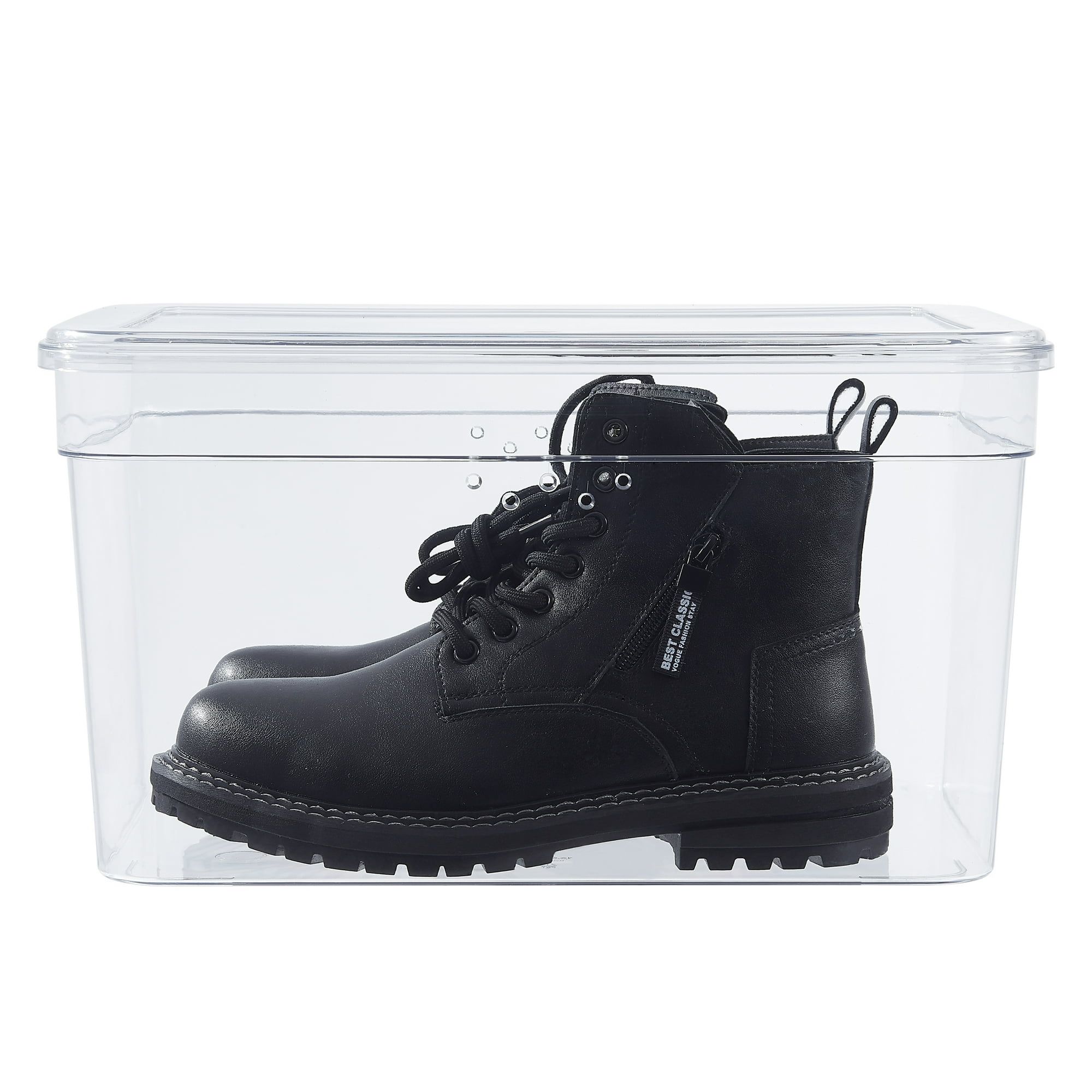 extra tall shoe box includes 1 lid & 1 container, accommodates adult size shoe box with most wide and tall shoes. The size of shoes can up to size 13 for men and size 14 for women. This shoe organizer has small vent holes in the walls for breathability. It is ideal for storing high heels and can stack up together in same column, which is a huge helper for saving the space. This product is made by clear plastic which allows contents to easily be viewed. This product is an ideal solution for closet or under bed storage. The Mainstays Extra Tall Shoe Box is suitable for everywhere placement, such as closet, basement, garage, attic and more.