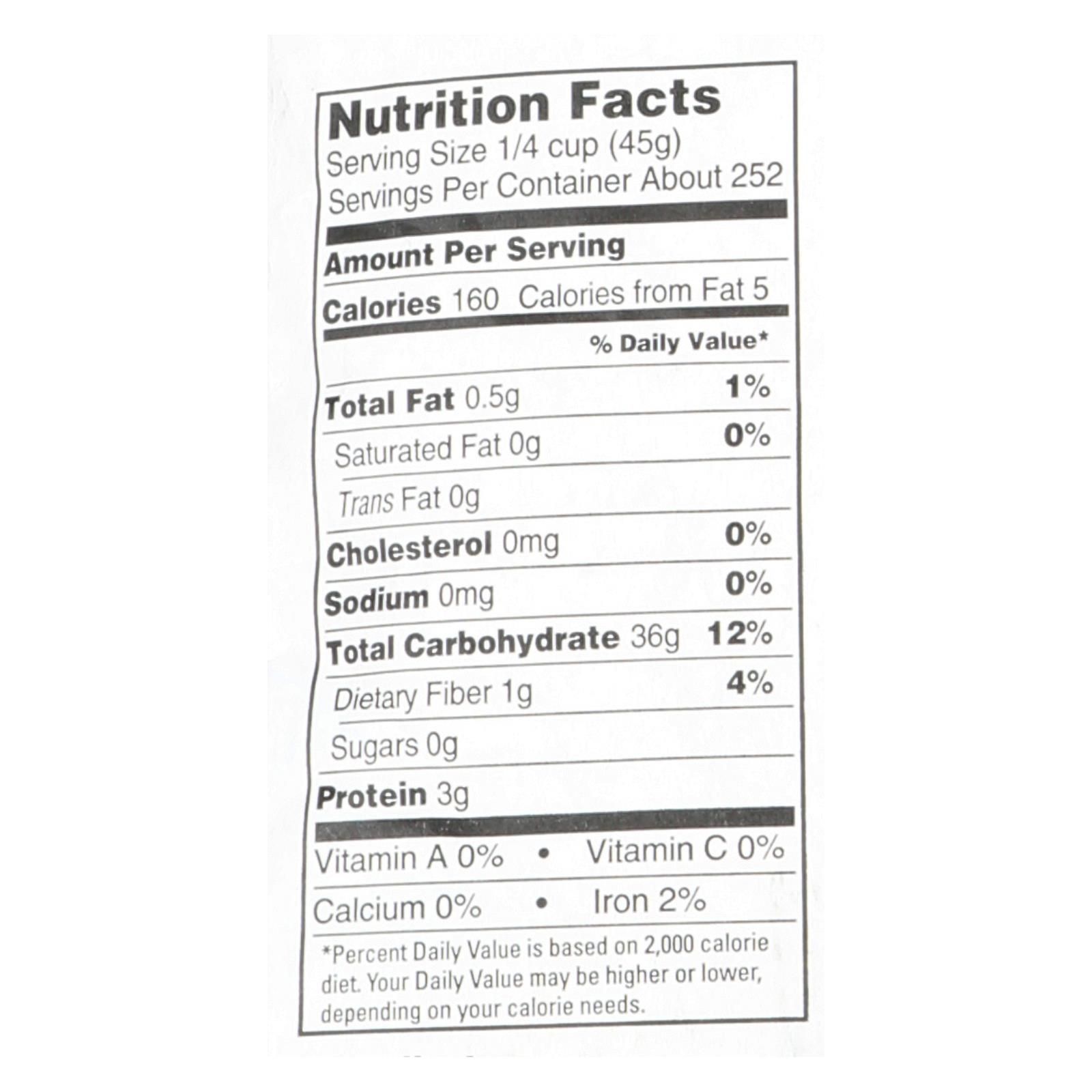 Lundberg family farms california white jasmine rice is an aromatic long grain rice your family will love. Fragrant, colorful and delicious, this rice is a perfect addition to meals when potatoes just won't do. Versatile organic goodness and light soft texture will make this rice an instant hit with children. Each bag of lundberg family farms california white jasmine rice contains 25 lbs. Of product, translating into about 252 servings and 160 calories per serving. See nutrition facts panel for allergens.