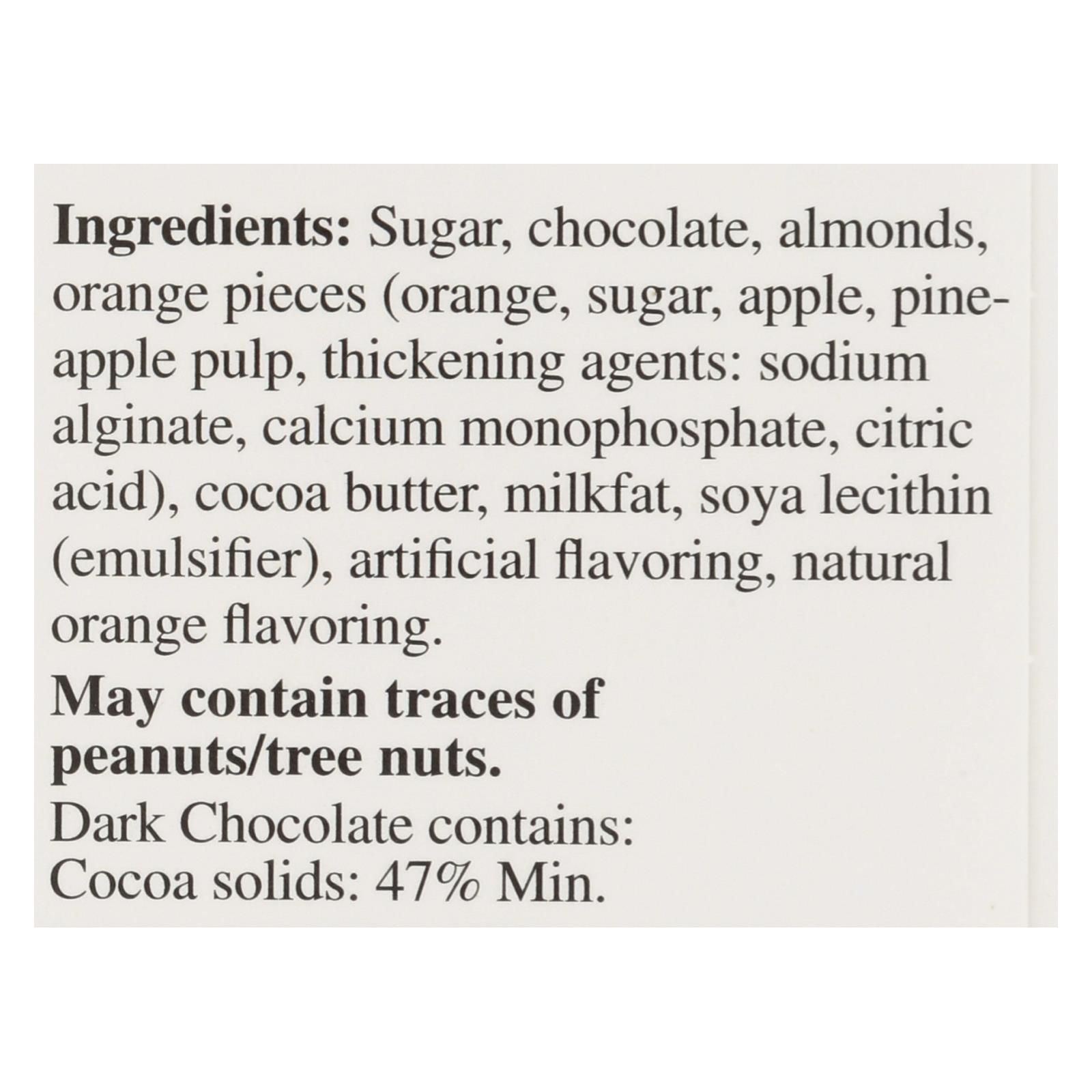 ingredients : sugar;chocolate;almonds;orange pieces;orange;apple;pineapple pulp;thickening agents: sodium alginate;calcium monophosphate;citric acid;cocoa butter;milkfat;soya lecithin;emulsifier;artificial flavoring;natural orange flavoring