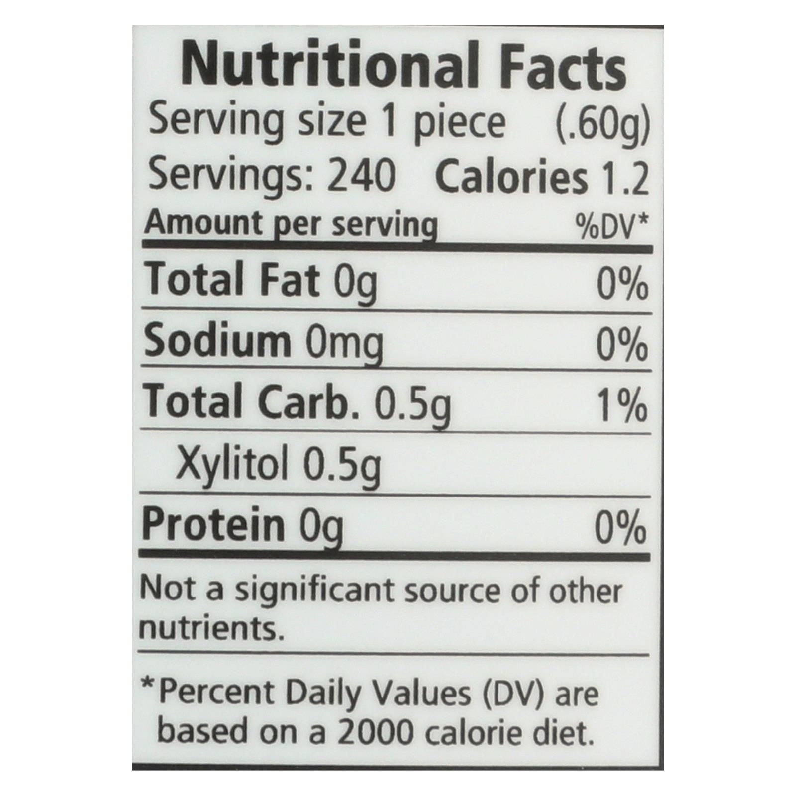 ingredients : xylitol;calcium lactate;magnesium stearate;gum arabic;natural flavor;peppermint oil;carnauba wax